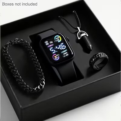покрытие > saat mağazası > 4pcs Men's LED Digital Electronic Watch & Bracelet Necklace Ring Set - Modern Smartwatch with Matching Strap, Compatible with Smartphones/Tablets/Laptops - Birthday/Christmas/Valentine's Gift for Him/Her